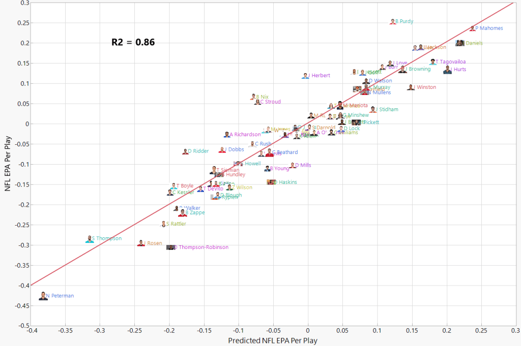 1. NFL EPA Per Play vs Predicted NFL EPA Per Play based on College-to-NFL QB Prediction Model (QBs with at least 150 snaps since 2015)